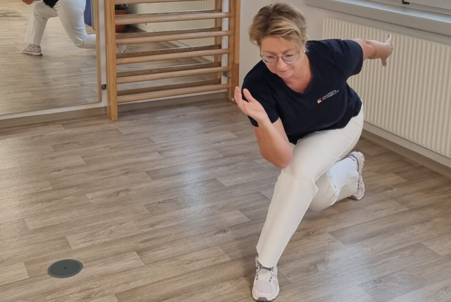 LANGSAM BEGINNEN – erst wenn der Bewegungsablauf sitzt in den Sprungmodus wechseln. Wenn das gut klappt, von einer Position in die andere springen – hin und her – die Arme wechseln sich dabei pendelnd ab. So entsteht eine Bewegung, die an Eisschnellläufer auf der Bahn erinnert